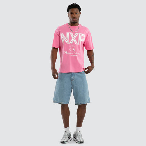 The Bank Raptor Tee in Pink features a box fit with regular length, dropped shoulder, and baggy sleeves. Made from a mix of recycled cotton in a soft wash.
